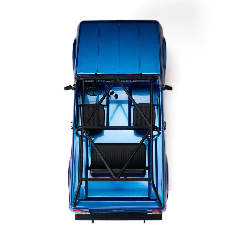 On the interior you'll find an injection molded dash, seats, pedals, shifters, door levers, window cranks, removable steering wheel and we've even added a turn signal lever on the steering column. The exterior includes an injection molded roll cage, rock sliders, bumpers, side view mirrors, door handles, windshield wipers, front grill, headlight buckets and taillight buckets. This is one highly detailed body.