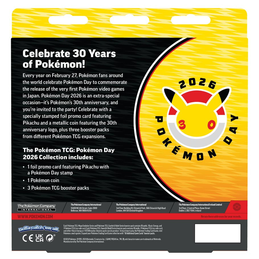 Every year on February 27, Pokémon fans around the world celebrate Pokémon Day to commemorate the release of the very first Pokémon video games in Japan. Pokémon Day 2026 is an extra-special occasion—it’s Pokémon’s 30th anniversary, and you’re invited to the party! Celebrate with a specially stamped foil promo card featuring Pikachu and a metallic coin featuring the 30th anniversary logo, plus three booster packs from different Pokémon TCG expansions.